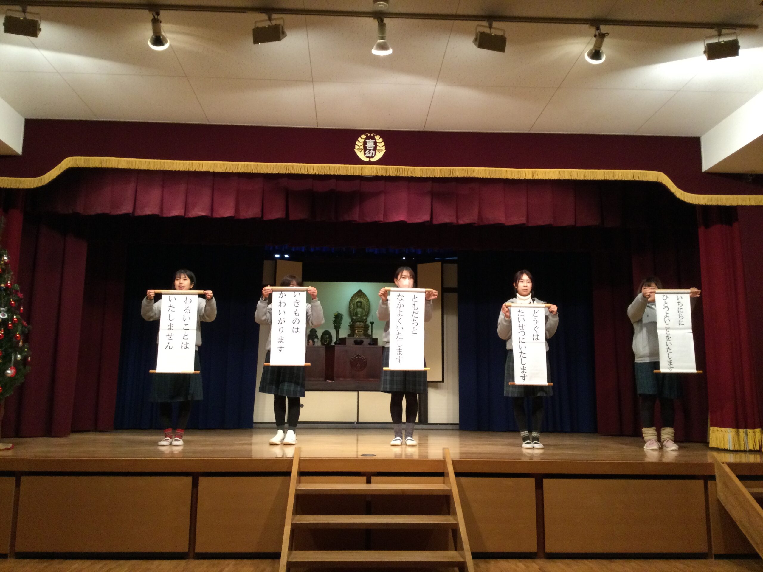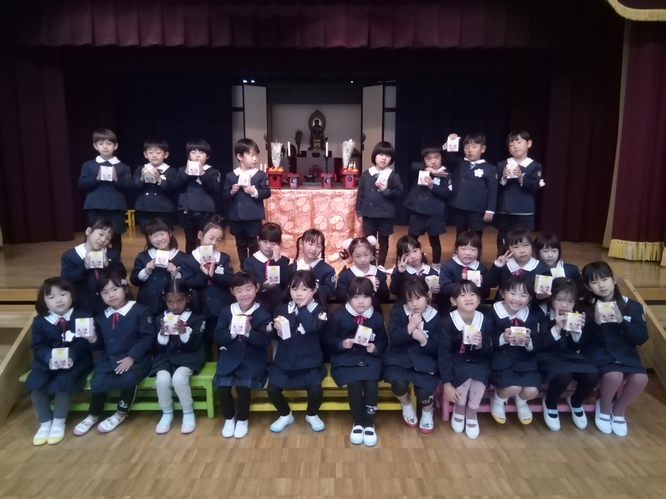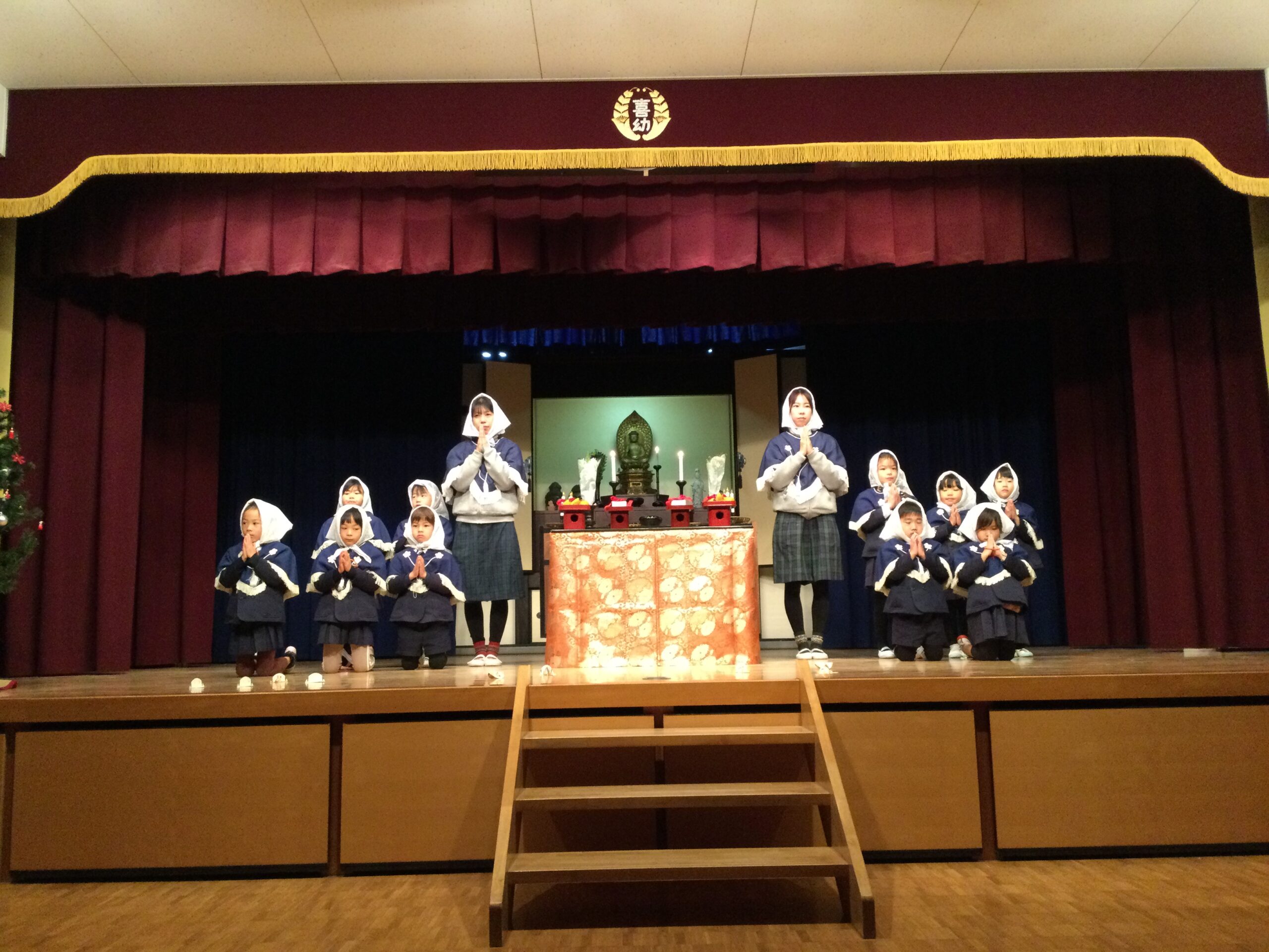 12月11日、成道会を行いました。子ども達は講堂に入る前に一礼し、手を合わせながら自分の席まで移動し、年長の代表の子ども達がおつとめを行い、成道会の準備を行いました。