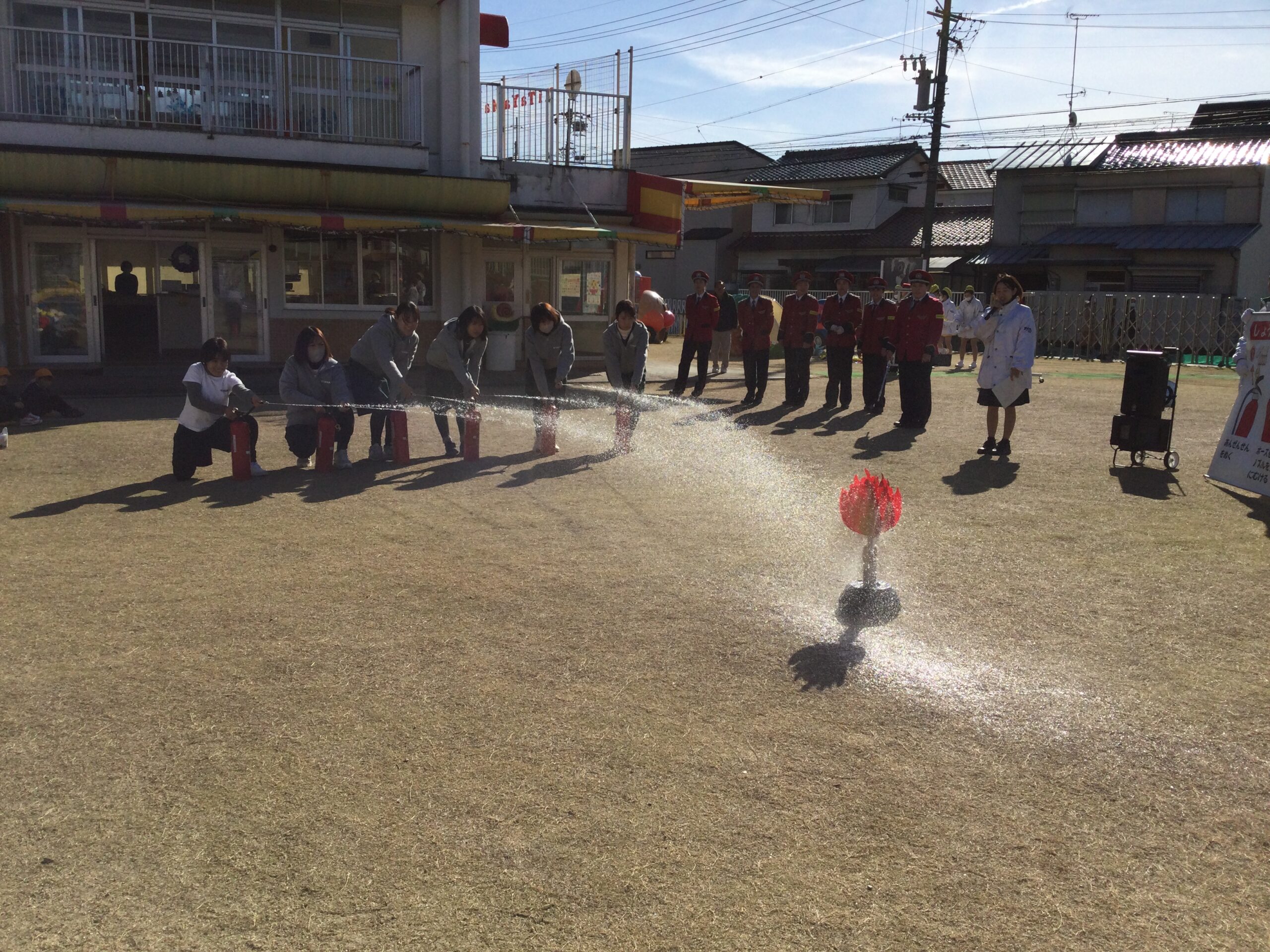 消火器による初期消火をの訓練をして、みんなで作ったプレゼントを渡しました。