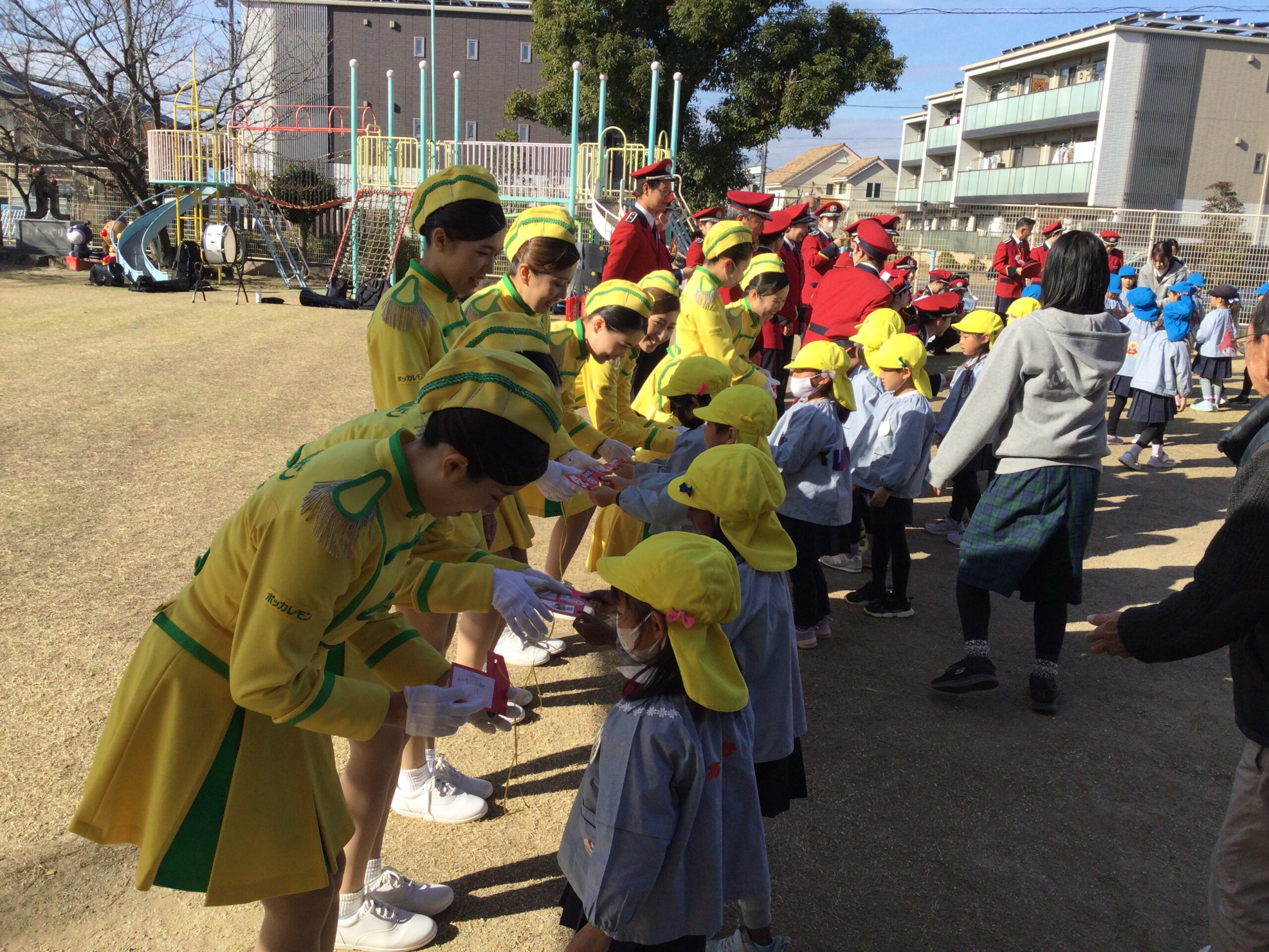 昼食後の外遊びで、フラフープを使って、リリーエンゼルスさんの真似をして遊ぶ姿も見られ、子どもたちにとっても思い出に残る一日となりました。ポッカレモン消防音楽隊皆さんありがとうございました。