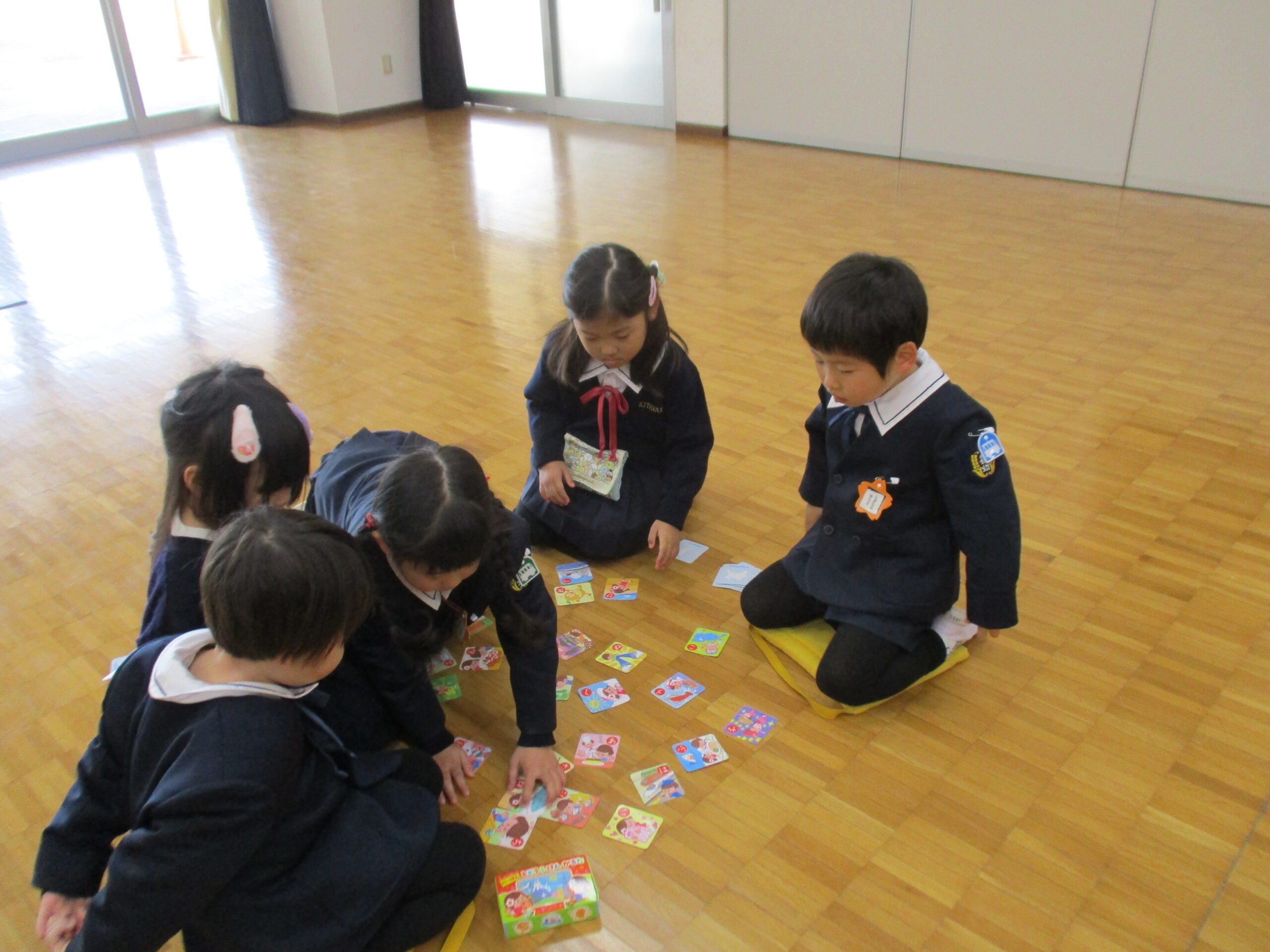 終業式に幼稚園からのプレゼントで持ち帰った、かるたを使ってかるた大会を行いました。