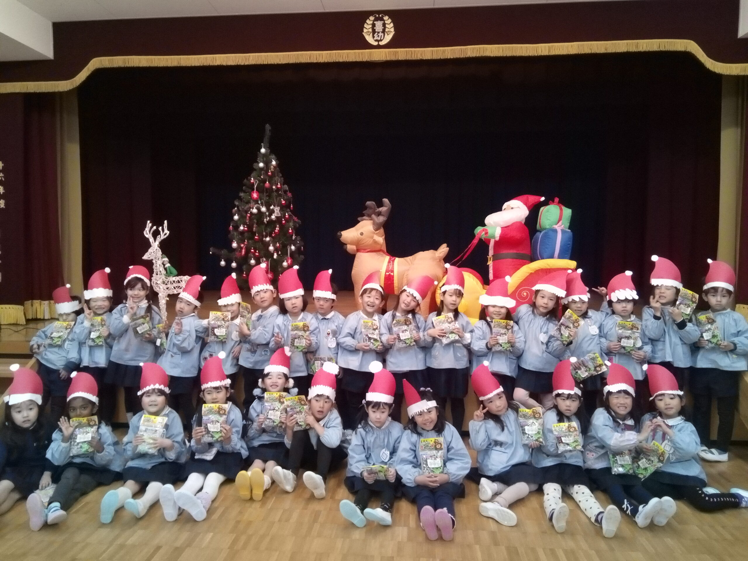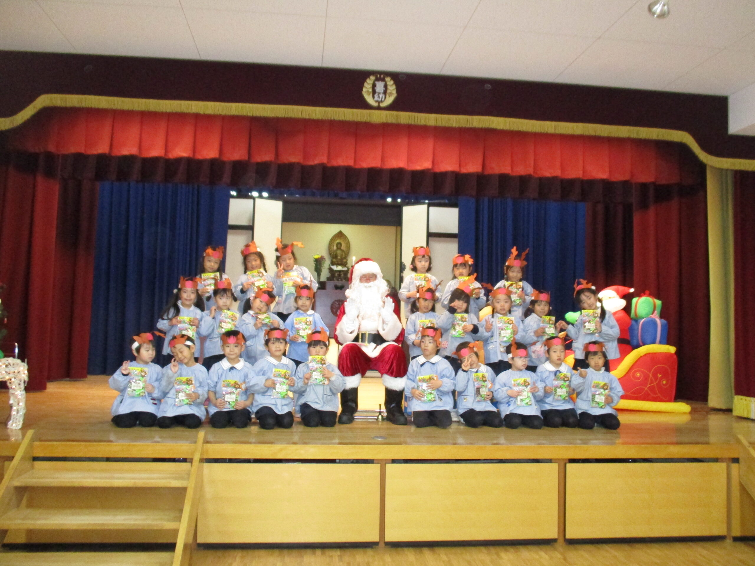 子ども達が作った帽子を被り、講堂に集まり、いよいよクリスマス会のはじまりです。